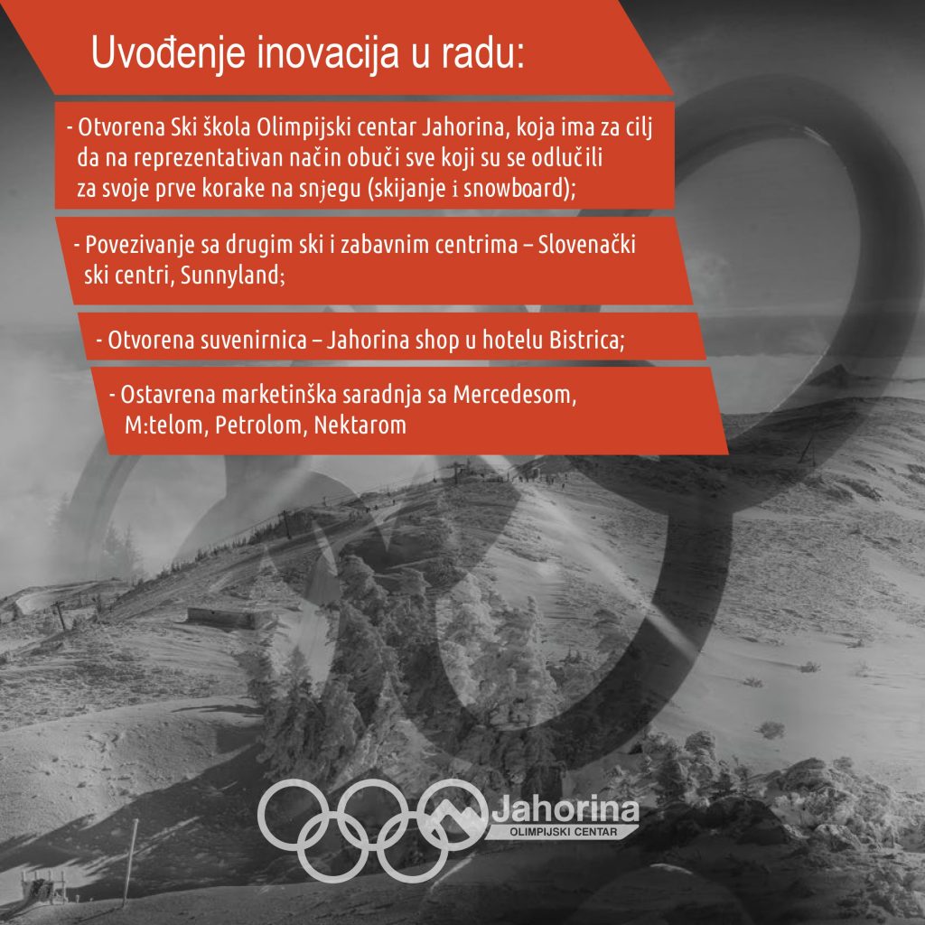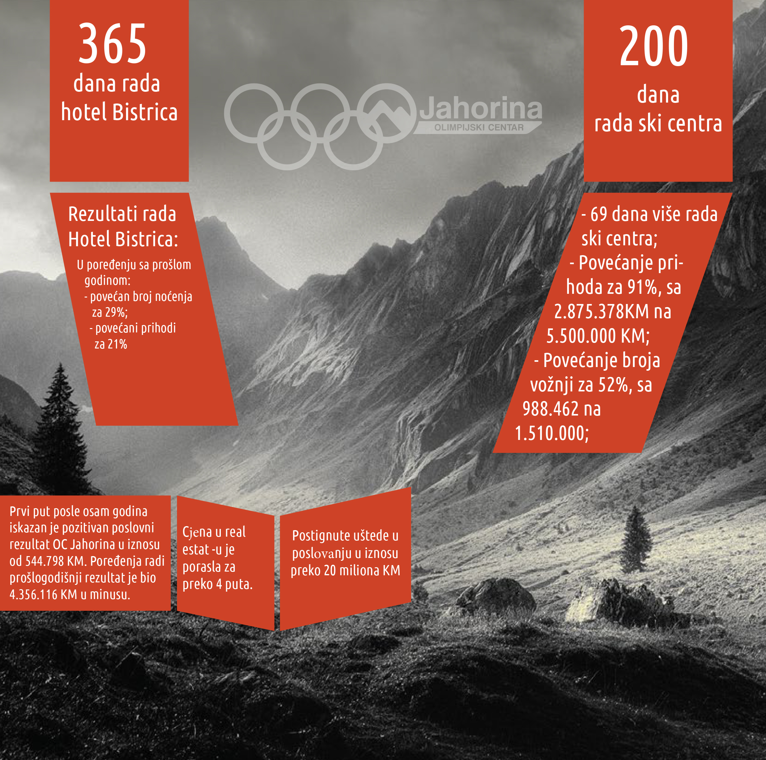 „Da, iza nas je 365 dana rada. Kada to kažem, zaista mislim 365 radnih dana zaposlenih koji su i najzaslužniji za novo lice i imidž Jahorine. Takođe bih istakao da pomoć koju dobijamo od predsednika Republike Srpske, gospodina Milorada Dodika, Vlade RS i Ministarstava trgovine i turizma je od velikog značaja za naš rad i postizanje rekordnih rezultata. Danas smo zvanično pustili u rad veštačko jezero, što je još jedan pokazatelj uspeha, a imamo: 365 dana rada hotela Bistrica i 200 dana rada ski centra, što je u poređenju sa prošlom sezonom ukupno povećanje za 52%. Prvi smo u regionu otvorili zimsku sezonu i poslednji zatvorili. Finansijski pokazatelji su nadmašili sva očekivanja, prihodi samo od skijališta su gotovo 5.500.000 KM, a prošle godine su bili 2.875.378 KM, što je za 91% više, dok je hotel Bistrica ostvario prihode bolje za 21%. Kod prihoda skijališta bih naglasio da smo od ski škola zaradili 80.000KM, dok prošle godine ovakva vrsta prihoda nije postojala, zatim od naplate parkinga smo zaradili 174.000KM, što je za 400% više u odnosu na prošlu godinu. Naravno, broj vožnji prati ovaj trend, pa je ovogodišnji broj vožnji od 1.510.000 veći za 52% u odnosu na prošlu godinu. Preduzeće je bilo ozbiljan gubitaš i teret Republici, a sada je prvi put posle osam godina iskazan pozitivan poslovni rezultat poslovanja u iznosu od 544.798 KM. Poređenja radi prošlogodišnji rezultat je bio 4.356.116 KM u minusu. Da bi se stekla kompletna slika, važno je napomenuti sa smo vodili računa i o troškovima i imali domaćinski pristup u poslovanju i tako smo postigli uštede u poslovanju u iznosu od preko 20 miliona KM. A najrealniji pokazatelj, prema kojem se sve turističke destinacije vrednuju je cena u real estat-u. Posle protekle zimske sezone cena u real estat-u na Jahorini je porasla za preko 4 puta. Počelo je da vlada interesovanje za Jahorinom kad velikog broja domaćih i stranih investitora, a u ovom trenutnku imamo 4 velika gradilišta. Posebno bih istakao da nam poseta Saveza slovenačkih ski centara i svetskih turističkih agencija mnogo znači jer lično smatram da je budućnost turizma u povezovanju i saradnji. Premijerno najavljujem da smo dogovrili saradnju sa njima i da će ski pas sa Jahorine važiti u svim slovenačkim ski centrima i obrnuto. Za mene to nije iznenađenje, jer sam od početka verovao u to da Jahorina ima taj potencijal i da ima najbolji odnos cene i kvaliteta i da je potrebno da prođe samo jedna sezona da to pokažemo i da svi to prepoznaju.“ izjavio je gospodin Dejan Ljevnaić, direktor OC Jahorina.