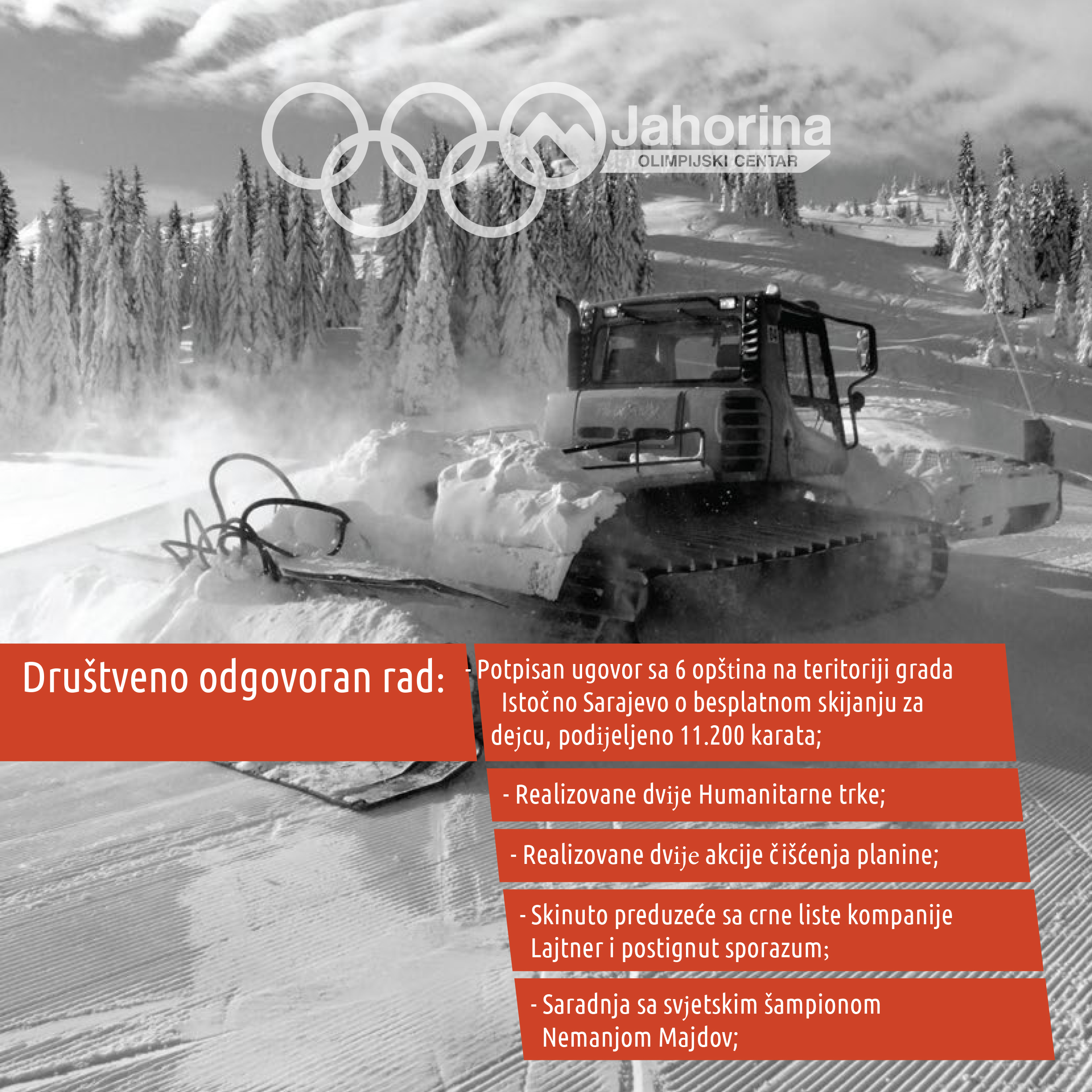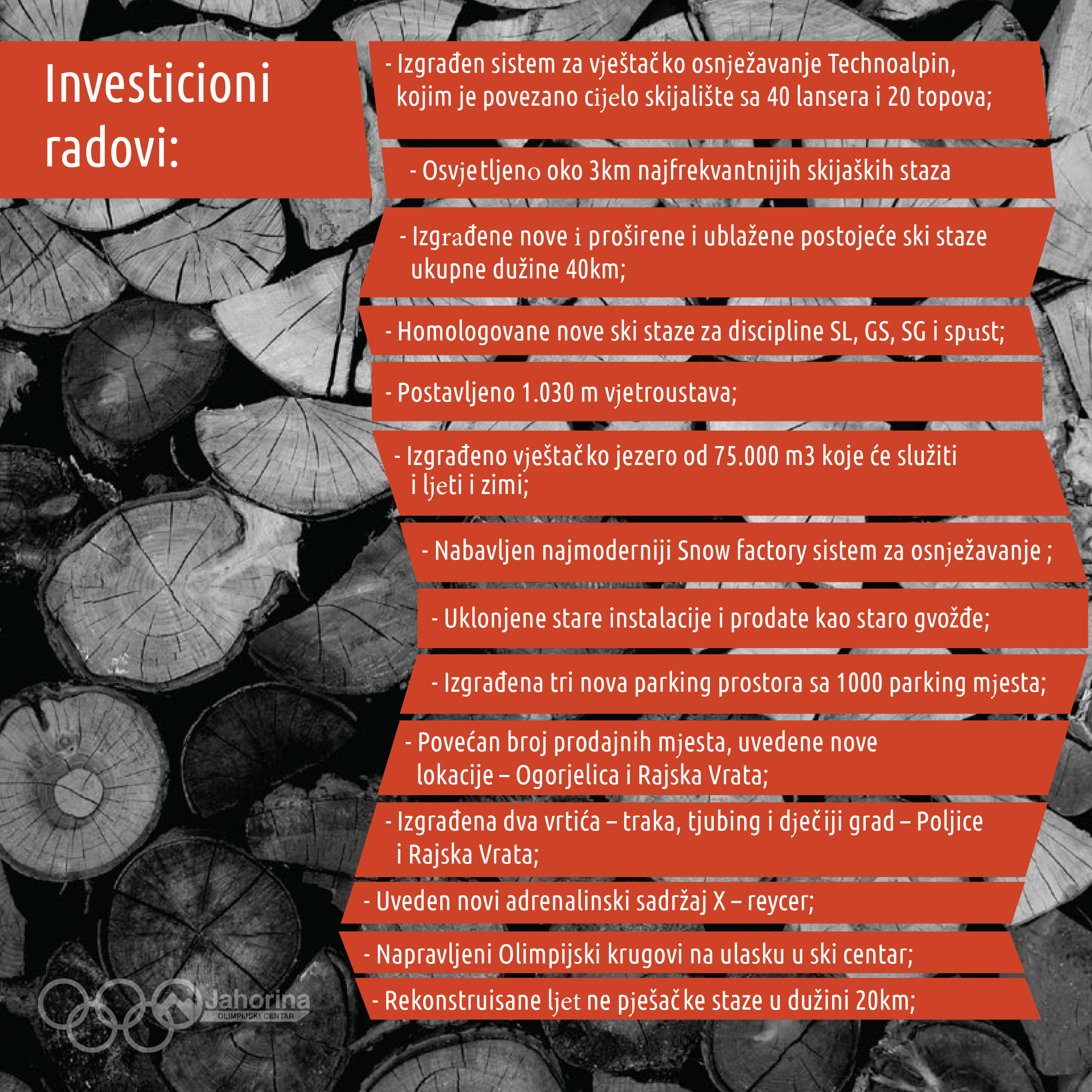Kod investicionih radova, naglasio je da će za sledeću zimsku sezonu biti kompletno izgrađen i završen sistem za vještačko osnježavanje proizvođača Technoalpin kojim će biti povezano cijelo skijalište sa 40 lansera i 20 topova i na ovaj način će se eliminisati najveći nedostatak koji je pogađao Jahorinu, a to je nedostatak snijega. Od ove sezone Jahorina nikada više neće imati problem sa snijegom. Sada je izgrađena sigurnost u snijeg i uspješne zimske sezone na Jahorini. Uz izgradnju Sistema, izgrađene su i markirane nove i proširene i ublažene postojeće ski staze ukupne dužine 40km, među kojima su i homologovane staze za discipline SL, GS, SG i spust.