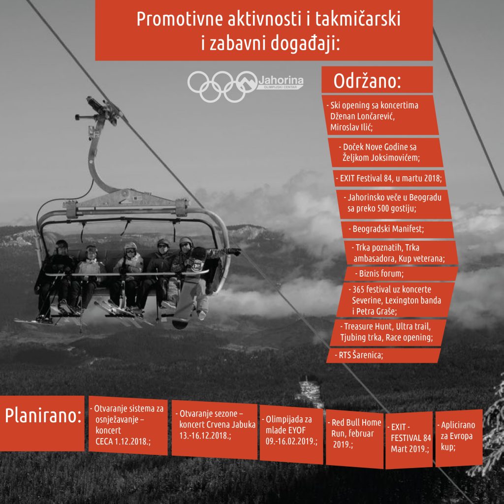 Olimpijski centar Jahorina za predstojeću zimsku sezonu planira Otvaranje sistema za osnježavanje uz koncert Cece Ražnatović, 1.12.2018. i otvaranje sezone Retro Ski opening uz koncert Crvene Jabuke i zanimljiva dešavanja 13.-16.12.2018. Ova zimska sezona će biti posebna za sve, jer je u februaru Olimpijada za mlade EYOF 09.-16.02.2019., kojom će bukvalno biti vraćen stari Olimpijski sjaj Jahorini.