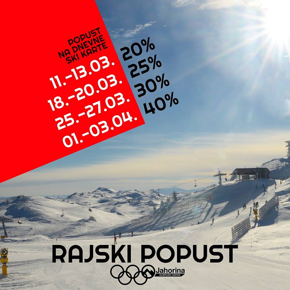 mart 15, 2019Iako je proljeće blizu, snježna idila na Jahorini se nastavlja i nakon više od 105 dana skijanja. Savršeno uređene staze sa čak 75 cm snijega najavljuju odlično skijanje do aprila. Novi snijeg koji je padao prethodnih dana zasigurno će maksimalno produžiti uživanje na olimpijskoj planini Jahorini. Posebna pogodnost za sve ljubitelje skijanja i snowboard-a su pored toplijeg vremena, suncem okupanih skijaških staza, dana koji duže traje, i popusti kojima će obradovati sve posjetioce. Rajski popusti će važiti od 11. marta svakog ponedeljka, utorka i srijede i dostizati čak do 40% dok je posljednji, treći, promo vikend od 28. do 31. marta kada će popust na sve ski karte koje se kupe i iskoriste u navedenom terminu iznositi 20%.